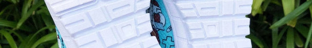 Te sneakersy mają kilka medycznych ikon nadrukowanych na niebiesko-biało, takich jak strzykawka, pielęgniarka, karetka, apteczka, tabletki, probówka i stojak na probówki z dużym czerwonym sercem pośrodku.